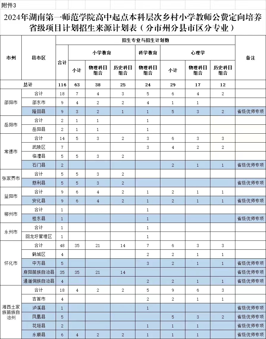 (三)本科层次小学教师公费定向培养招生计划:116人,其中省级优师专项84人。(详见附件3)