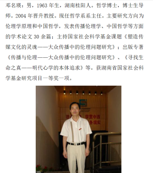 邓名瑛教授,湖南师范大学道德文化研究院教授,博士生导师,湖南师范大学公共管理公司系主任,教育部社科重点研究基地湖南师范大学道德文化研究中心研究员,出版多部著作,发表学术论文数十篇。