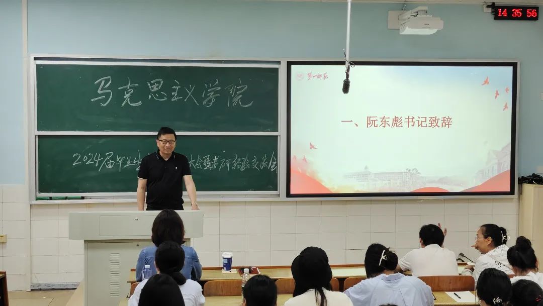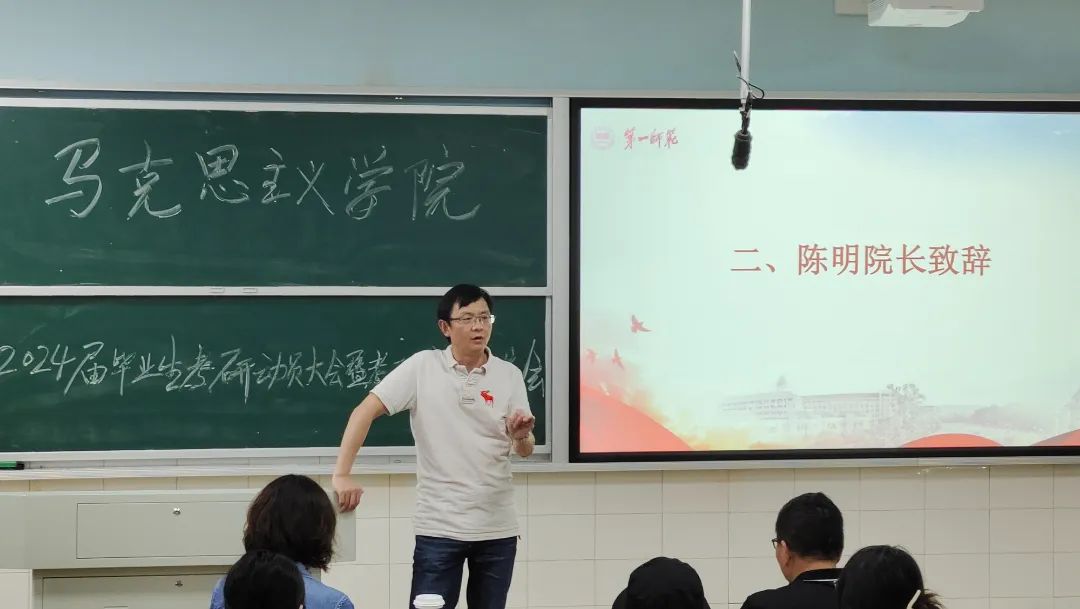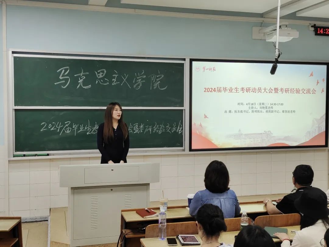为激发同学们的考研热情,解答他们在考研方面的疑惑,公司于4月18日在怀中南202教室举办了2024届毕业生考研动员大会暨考研经验交流会。本次大会邀请了来自2019级思政1班的符浪海、朱强华、毛依凡、朱继顺、邓思、余凤娇和夏晶晶共7名员工代表分享考研经验,马克思主义公司党委书记阮东彪、经理陈明、副书记胡英和雍容波老师莅临交流会现场。会议由学工办副主任刘艳霓主持,参会人员为2020级思政1班全体同学。