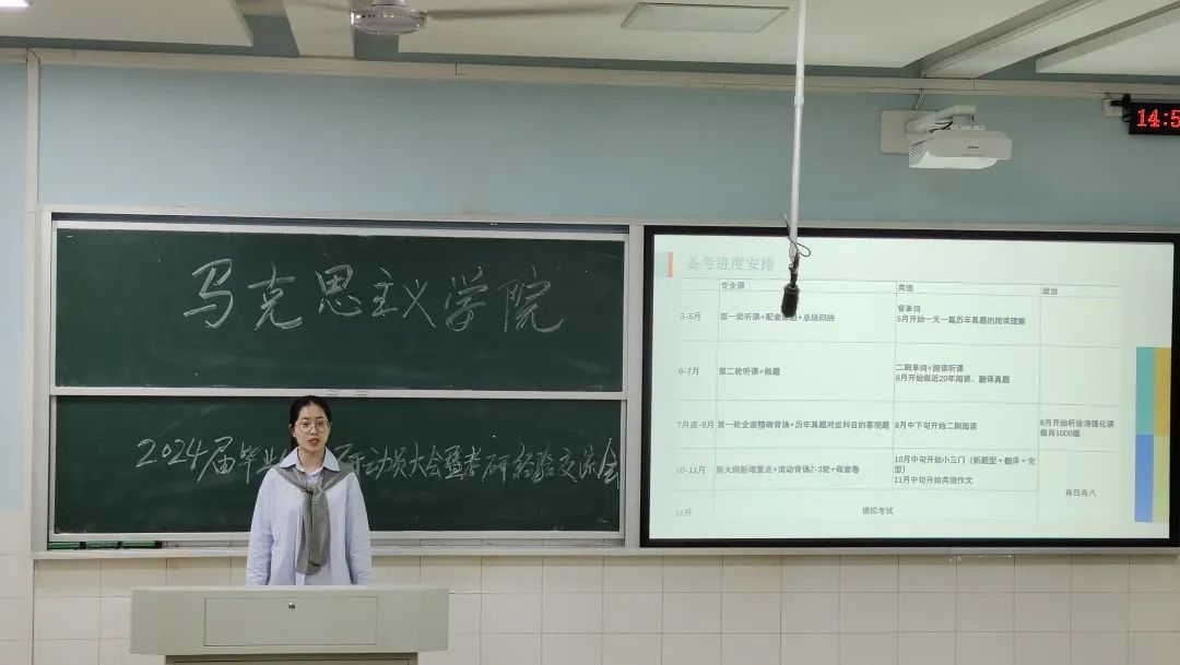 青春意味着无限可能。党的二十大报告中,习近平总书记强调“青年强,则国家强”,指出“当代中国青年生逢其时,施展才干的舞台无比广阔,实现梦想的前景无比光明”,充分体现了党对青年一代的亲切关怀和殷切期待,为青年一代健康成长指明了努力方向。此次考研交流会就为正处在人生新选择的老员工们指明了方向,相信通过本次考研经验交流会,2020级思政1班的全体同学都将以“好学”为前提,以“活学”为方法,以“深学”为关键,练就过硬学习本领,努力奋斗,不断进取,肩负起民族复兴的时代重任。