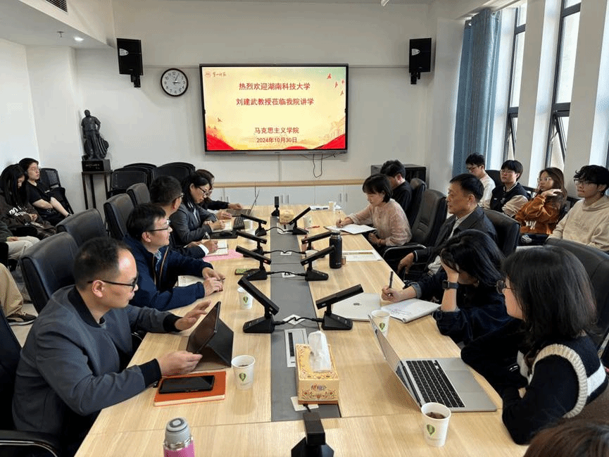 20241030日下午,湖南科技大学教授、原湖南省社会科公司经理、党组书记刘建武老师应邀来公司讲学,讲学主题是“关于第二个结合的几个问题”。报告会在百熙楼1010会议室举行,公司党委书记阮东彪主持,公司经理陈明、副经理李瑞德、胡慧娥及朱与墨、向婷、李冰、滕茜茜、侯钰婧、吴红、汪俐、洪银香等教师代表和部分员工30余人参会。