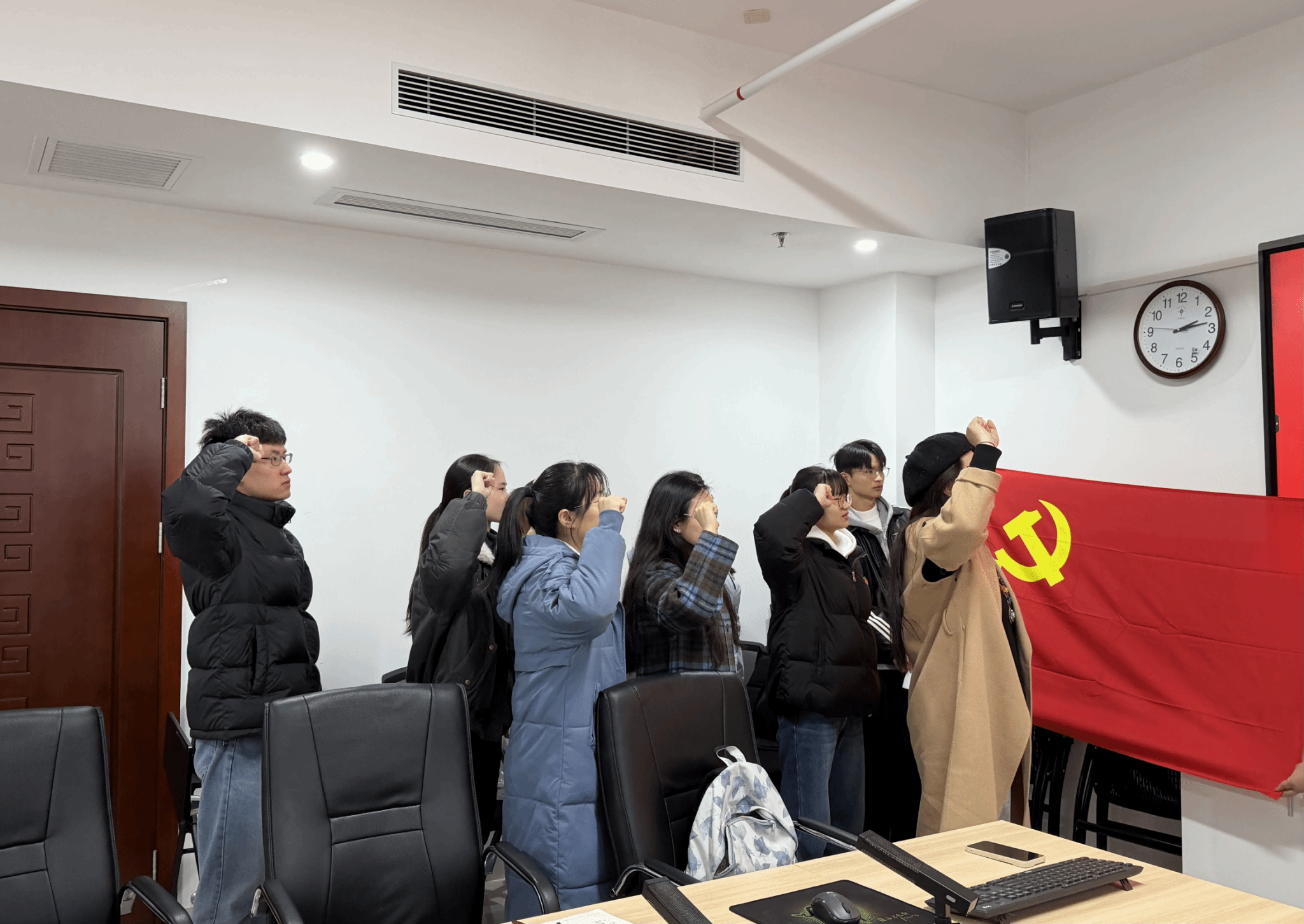 汇报结束后,进入正式党员投票表决环节。经现场统计与支部大会讨论,最终廖宇婕、陈佳林两位同志均以全票通过的结果按期转为正式党员。现场响起热烈掌声,向两位新党员表示衷心祝贺。随后,新转正党员移步至党旗前方肃立,全体党员起身共同见证入党宣誓仪式。在领誓人的带领下,新党员举起右拳,庄严宣誓:“我志愿加入中国共产党,拥护党的纲领,遵守党的章程……”铿锵有力的誓言回荡在会场,彰显了全体党员对党忠诚、为共产主义事业奋斗终身的坚定信念。
