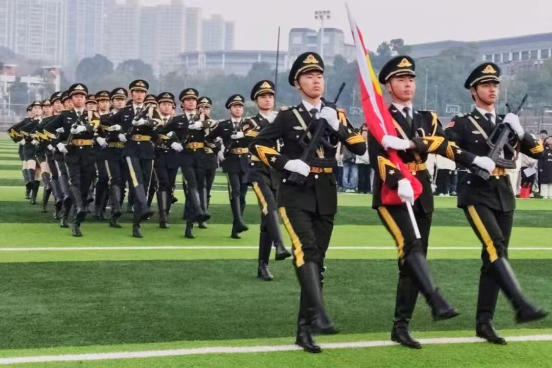 “升旗仪式现在开始!”随着主持人一声宣告,身着礼服的国旗护卫队队员昂首阔步,迈着铿锵有力的正步护送国旗走向升旗台,每一步都踏得坚定沉稳。当激昂的《义勇军进行曲》奏响,鲜艳的五星红旗迎着第一缕晨光徐徐升起,全体师生肃立行注目礼,心中涌动着对祖国的无限崇敬与热爱,整个田径场弥漫着庄严肃穆的氛围。