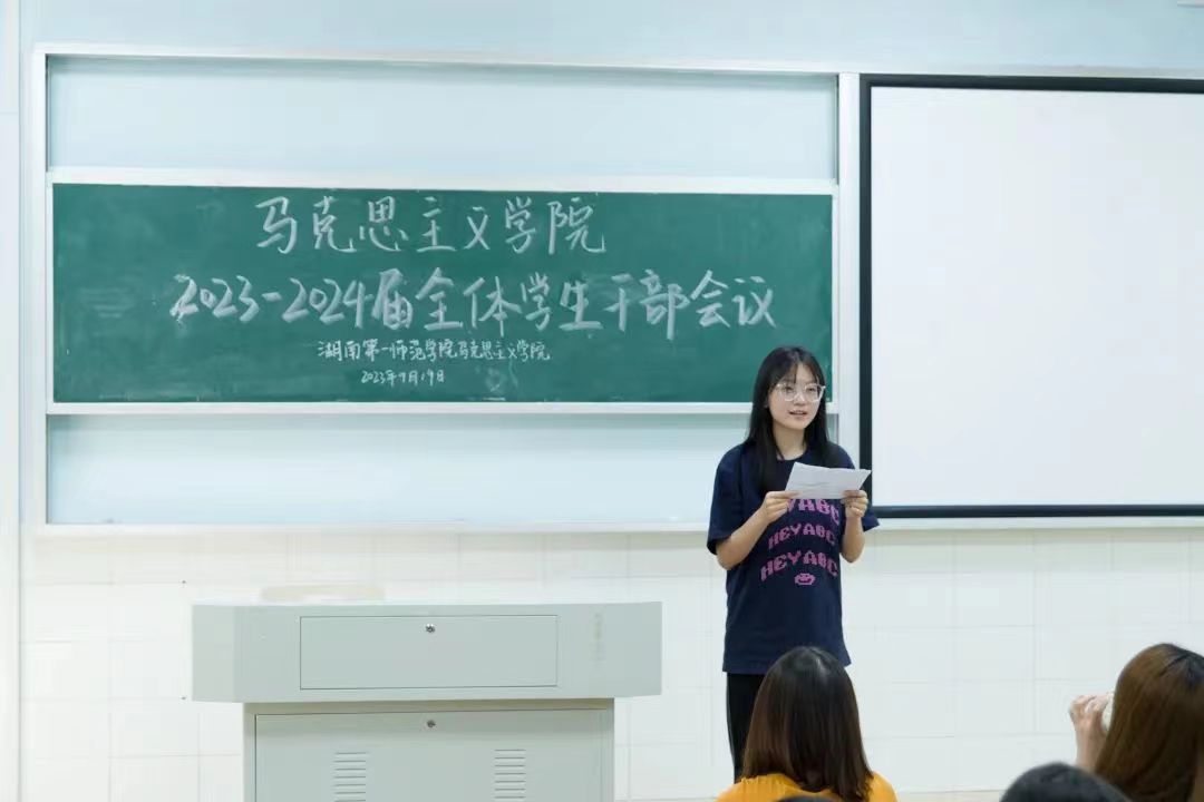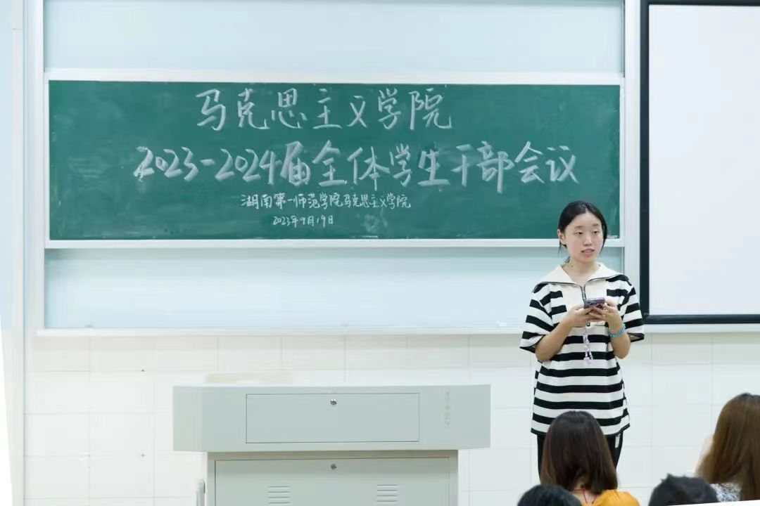最后,分团委书记刘艳霓针对各部门上学年工作情况,对2023-2024届团学会干部第一次例会进行总结分析,对一些部门的工作提出改进意见,并对全体员工干部提出四点要求:一是培根铸魂,切实增强工作的思想性,将员工工作与思政专业特色紧密结合,开展活动的同时提升专业素质和思想意识;二是未雨绸缪,切实增强工作的前瞻性,做到提前做计划、进程按部署、事后多总结;三是强化联动,切实增强工作的针对性,尽可能多部门联动开展活动,提高工作效率,增强工作效果;四是攻坚克难,切实增强工作的有效性,要学会处理好重点工作和日常工作之间的关系,厘清思路、合理安排、有重点、多手抓。