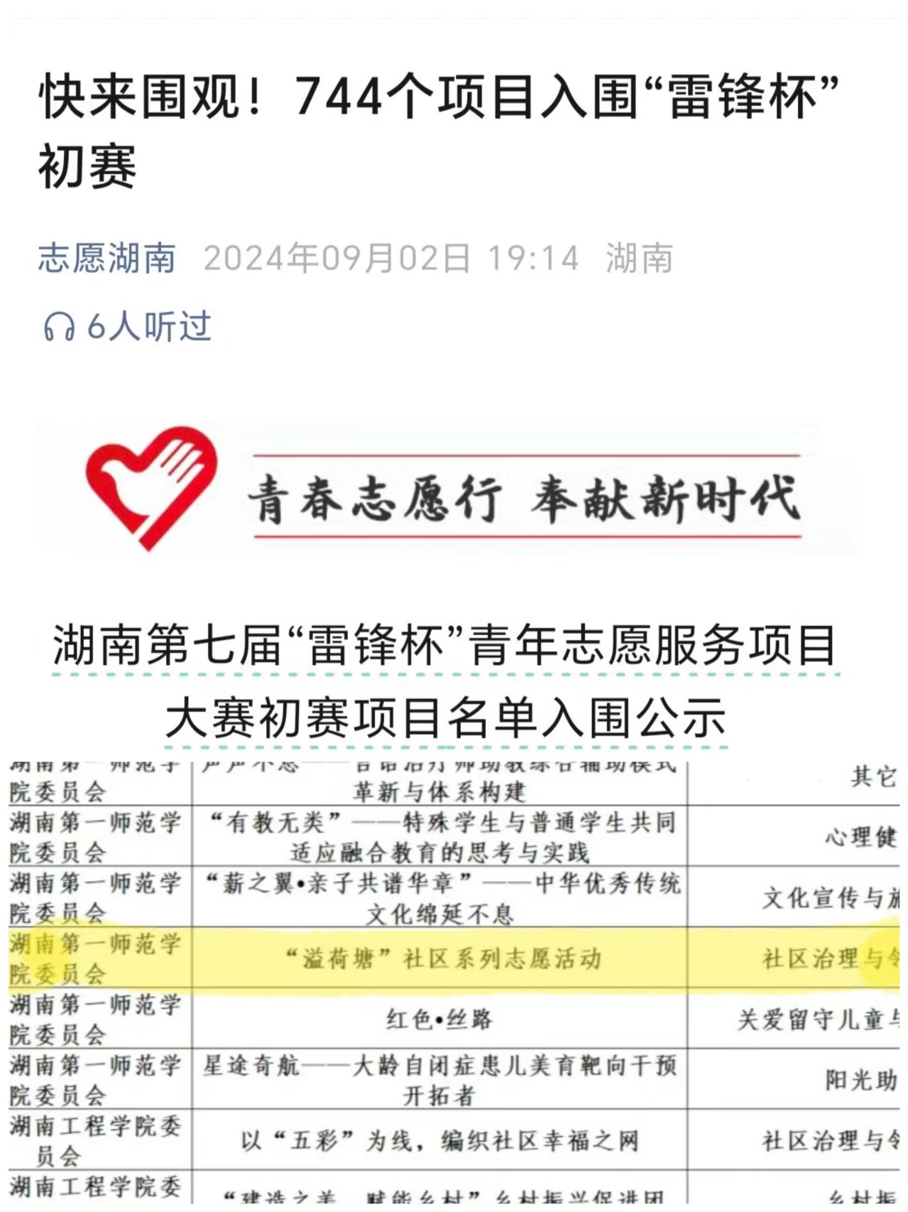 2024年9月3日,志愿湖南公众号发布湖南省第七届“雷锋杯”青年志愿服务项目大赛初赛项目名单,公司 “溢荷塘”社区系列志愿服务项目成功入围。