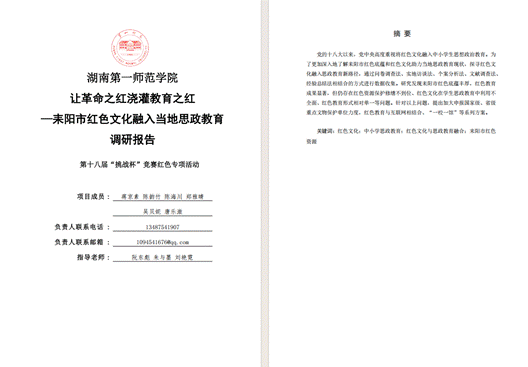 2.2023年《让革命之红浇灌教育之红——耒阳市红色文化融入当地思政教育调研》获第十五届“挑战杯”湖南省红色专项二等奖(中国共产主义青年团湖南省委员会)