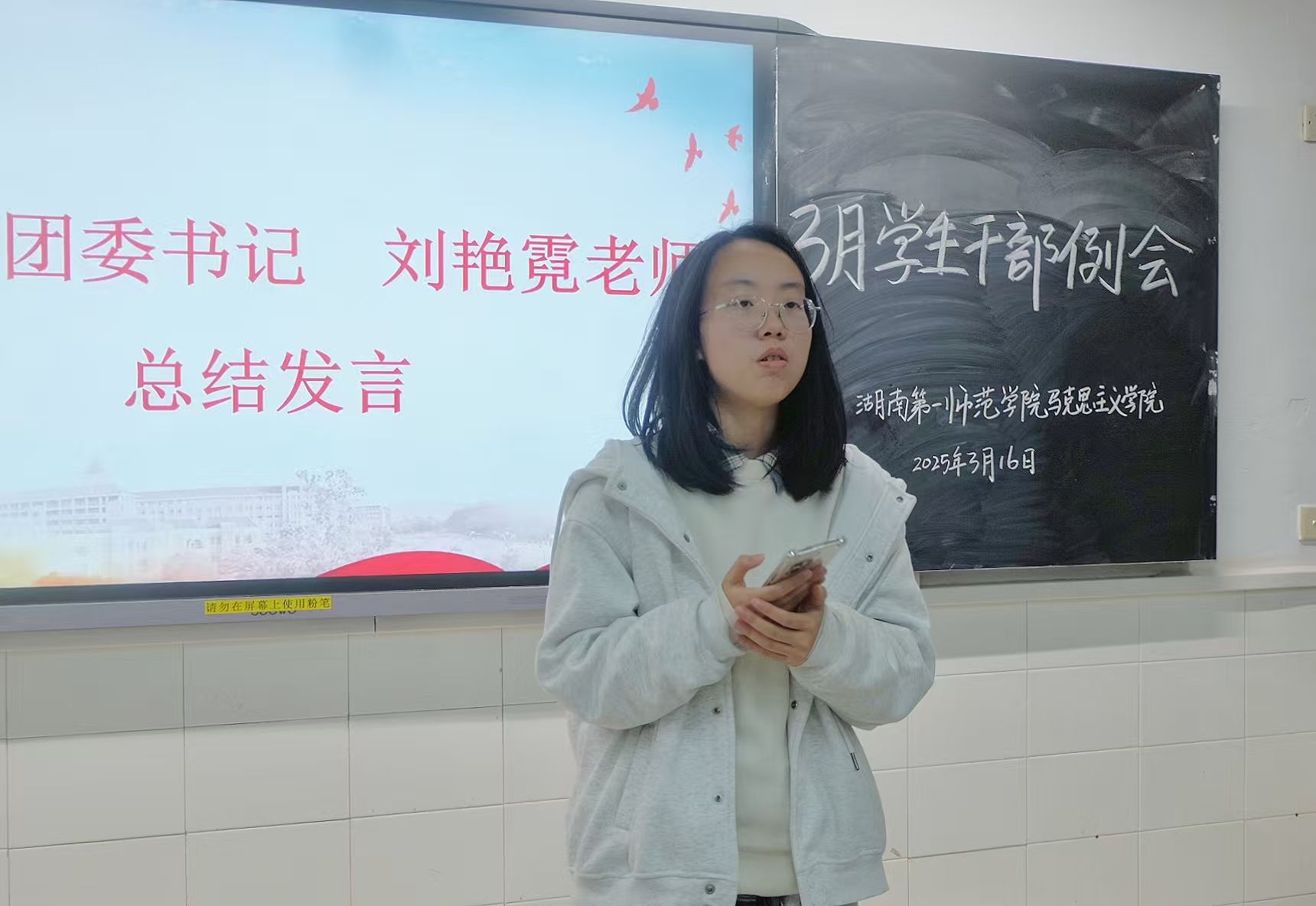 刘艳霓老师在总结发言中,充分肯定同学们前期工作成果。她强调,员工工作要以服务同学为宗旨,打造公司特色品牌。针对近期工作表现与经验分享,刘老师对员工干部提出四点要求:一是深化 “传帮带” 机制,保障工作交接顺畅;二是强化价值引领,增强责任感与使命感;三是完善部门档案管理,确保工作留痕、有据可查;四是加强部门协作沟通,凝聚工作合力。