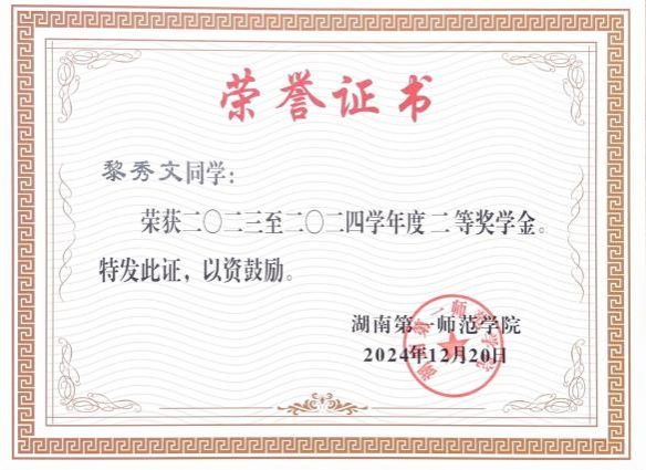 “学而不思则罔,思而不学则殆。”自大一入学起,黎秀文便以严格的自我要求锚定成长方向,秉持“人生万事须自为,跬步江山即寥廓”的信念,在学业道路上稳步前行。她始终坚持明确的目标导向,以扎实的知识储备筑牢发展根基,其专业成绩与综测排名逐年攀升,。在专注理论学习的同时,她还注重多维能力的拓展,积极考取专业技能证书,主动投身学科竞赛,将理论学习与实践应用有机结合起来。凭借着勤勉不辍的学习态度与锐意进取的拼搏精神,她荣获了国家励志奖学金、校三好员工、二等奖学金等荣誉。