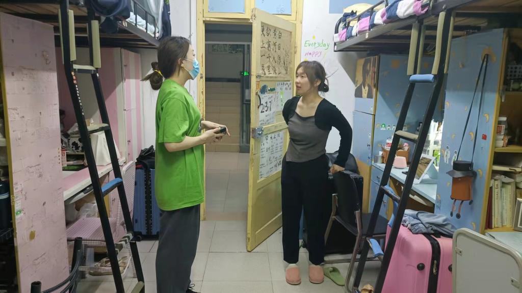 3月15日晚上,辅导员刘艳霓走访了11栋女生寝室,了解毕业生考研考编情况,动员同学们积极参加校园招聘。同时提醒同学们停止订外卖、网购,非必要不出校;寝室卫生要保持干净整洁,做到每日至少30分钟的通风,每周进行一次消毒。最后,刘老师要求大家保持自律,严格遵守各项防疫规定,筑牢疫情防线,以防疫情的发生。