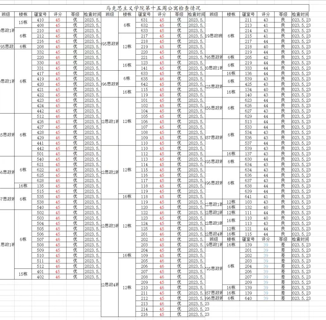 第十五周学风、宿舍文明建设检查结果