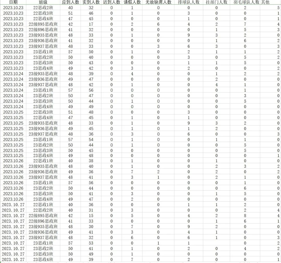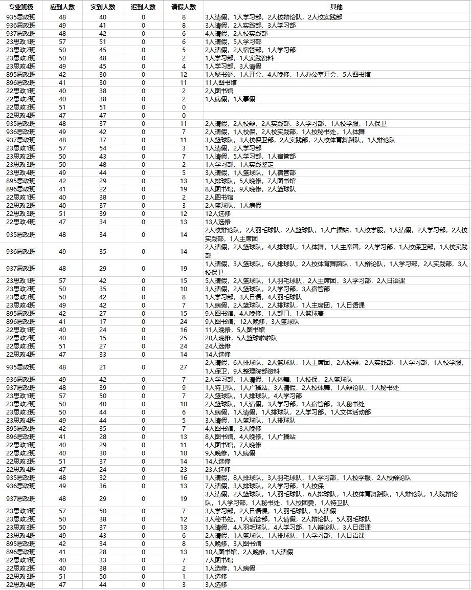 本周早自习大部分同学表现良好,但仍有部分同学缺席,名单如下:23级937思政班:陈怡冰两次 、24万源源一次 、36刘思思一次 ;23级936思政班:42李中翰一次、40陈龙云一次 ;23思政1班:52王彬彦一次 ;22级895思政班:02汤雅哲一次、13周佳一次、19李依菲一次、20胡北一次、22周婧依一次、36张苗一次。对以上同学予以提醒一次处理,望其他同学引以为戒。