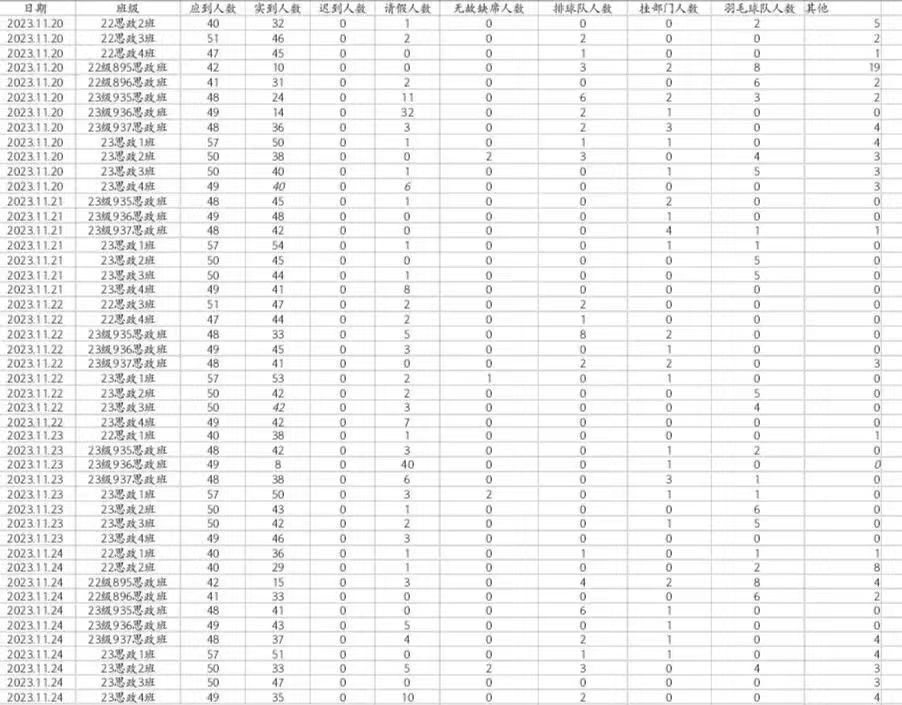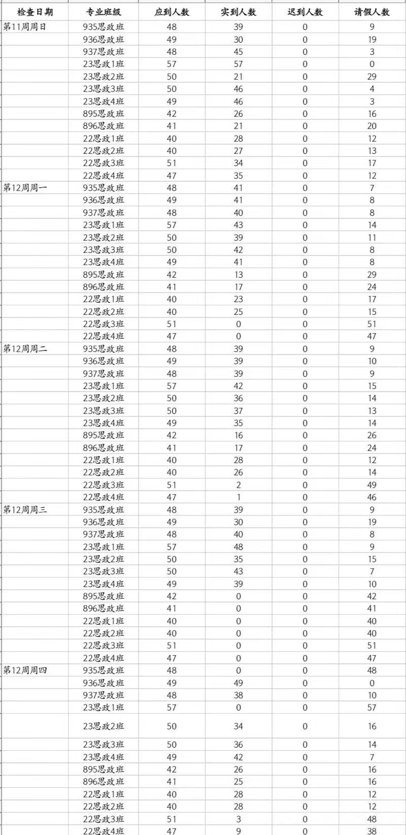第十二周情况良好,天气逐渐寒冷,同学们有的坚持到班,有的在寝自习,但无特殊情况时仍有部分同学出现缺席现象。23思政1班:31杨叔婷2次,32田翠莲1次;23思政2班:27肖乐1次,34方子成1次。