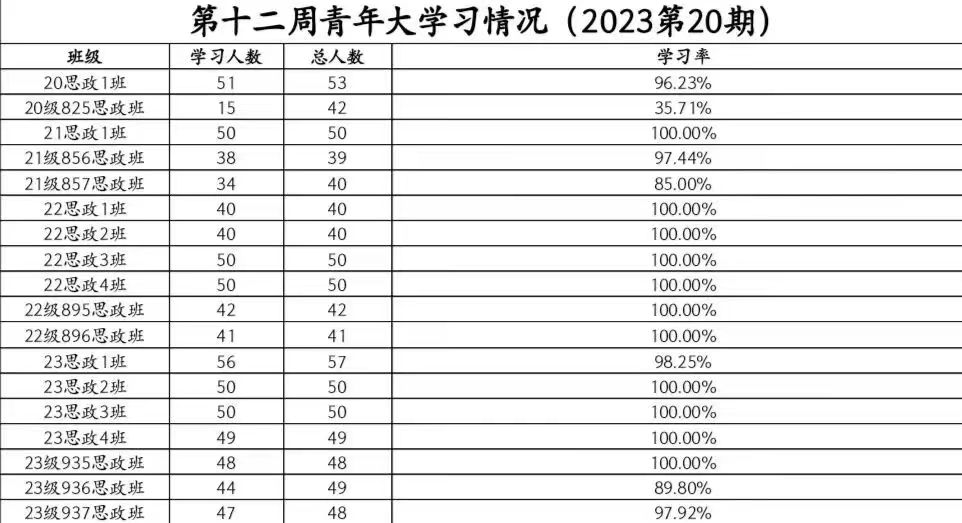 在本次青年大学习,21级思政1班、22级思政1班、22级思政2班、22级思政3班、22级思政4班、22级895思政班、22级896思政班、23级思政2班、23级思政3班、23级思政4班、23级935思政班学习率达到了100%,在这里提出表扬;