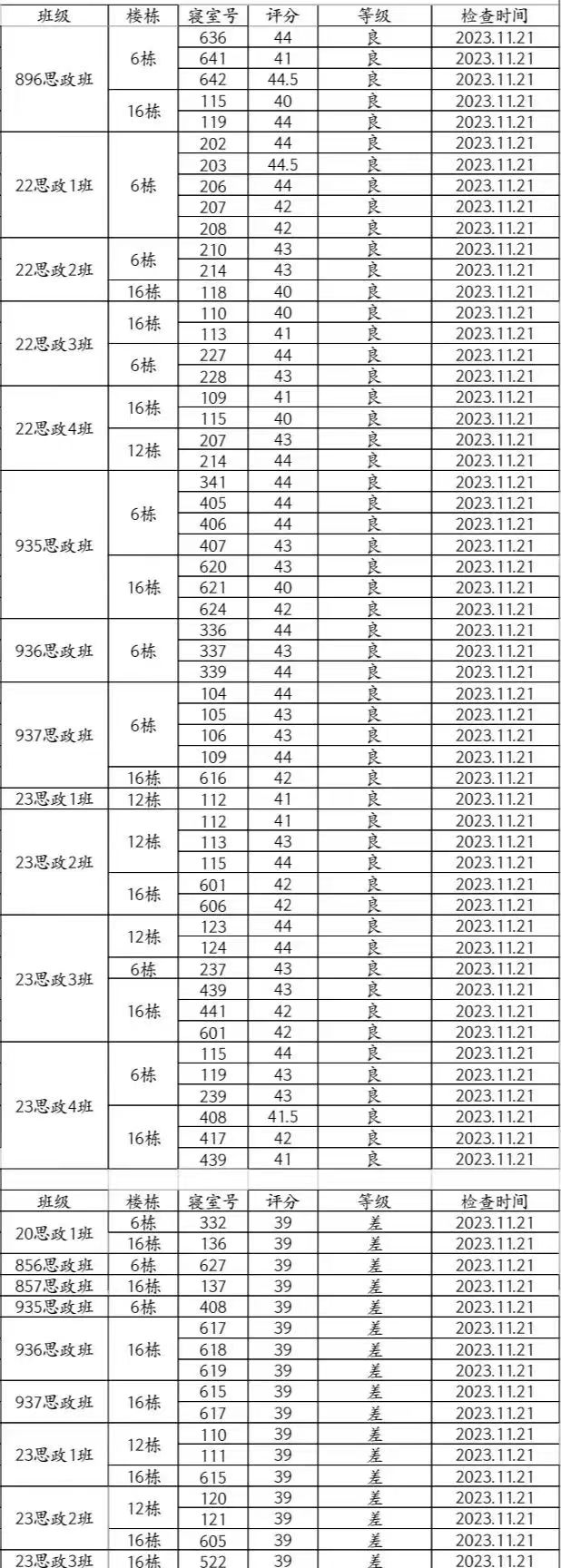本周卫生检查情况总体表现较差,其中937思政班与23思政1班混寝16栋615(杨程、李书畅、陈国颖、全启航)、936思政班与937思政班混寝16栋617(王润佳、丁继涵、阳浩田、欧阳增学)、20思政1班6栋332(李馥君、张嘉怡、宋维佳、曾艳芳)、20思政1班16栋136(欧阳琦、周亮、阳可豪)、856思政班6栋627(刘书筠、邓利菲、李欣悦、郭斯颖)、857思政班16栋137(丁嘉豪、周靖浩、符灿宇、田畅轩)、935思政班6栋408(舒爽、罗羽茜)、936思政班16栋618(杨恩旭、刘锦洋、张汗泽、傅灏文)、936思政班16栋619(李中翰、何泳先、陈龙云、陆琦)、23思政1班12栋110(毛玲、朱婉萱、杨娜、阳云云)、23思政1班12栋111(罗嘉璐、童慕雪、李汶雯、丁蕾)、23思政2班12栋120(唐莹颖、刘思怡、张婷、陈李若兰)、23思政2班12栋121(方子成、孙诗越、彭诗景、曹诗怡)、23思政2班16栋605(肖楚湘、陈柯龙、李金峰、吕帅)、23思政3班16栋522(覃坤、盛宇琪、刘陆宇、欧阳文明)等宿舍卫生情况较差,仍需继续改进。希望大家共同努力,建立文明美丽清洁宿舍!