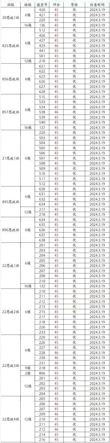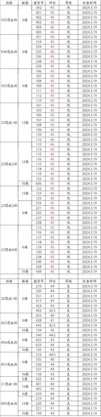 本周卫生检查情况较好,但20思政1班6-332(李馥君、张嘉怡、宋维佳、曾艳芳)、825思政班16-140(左东、吴耀轩、唐振武、徐荷羽)、895思政班16-123(曹昊、胡搏奥、陈海川、周建波)、896思政班6-641(芦艺丹、陈萝玥、谭佳、雷奕林)等宿舍仍需继续改进!希望大家共同努力,建设文明美丽宿舍!
