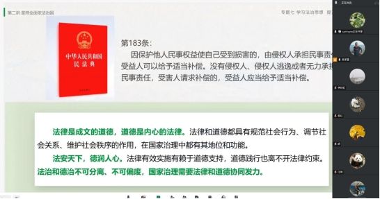 徐声慧分享了教材第六章第二节《坚持全面依法治国》。徐声慧从全面依法治国的根本遵循、坚持走中国特色社会主义法治道路、建设法治中国三个方面分析了坚持全面依法治国的指导思想、基本道路和具体实践要求。在全面依法治国的根本遵循中,详细介绍了习近平法治思想的形成过程、意义和主要内容。在坚持中国特色社会主义法治道路中,详细阐释了必须坚持中国共产党的领导、坚持人民主体地位、坚持法律面前人人平等、坚持依法治国和以德治国相结合、坚持从中国实际出发六条原则。在建设法治中国实践中,深入展示了一要建设社会主义法治体系,二要坚持依法治国、依法执政、依法行政共同推进、坚持法治国家、法治政府、法治社会一体建设,三要坚持全面推进科学立法、严格执法、公正司法、全民守法。